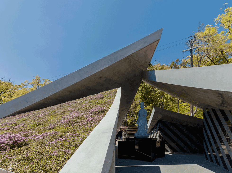 地面の一部を切り開き屋根とすることで、境内の参道が形作るかのようなデザインとした。